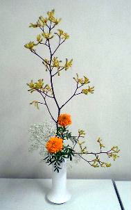 オレンジと黄色の元気な組み合わせと、ための効かないカンガルーポーの枝のラインをかすみ草のふわふわでバランスをとるという感じが出たかな。